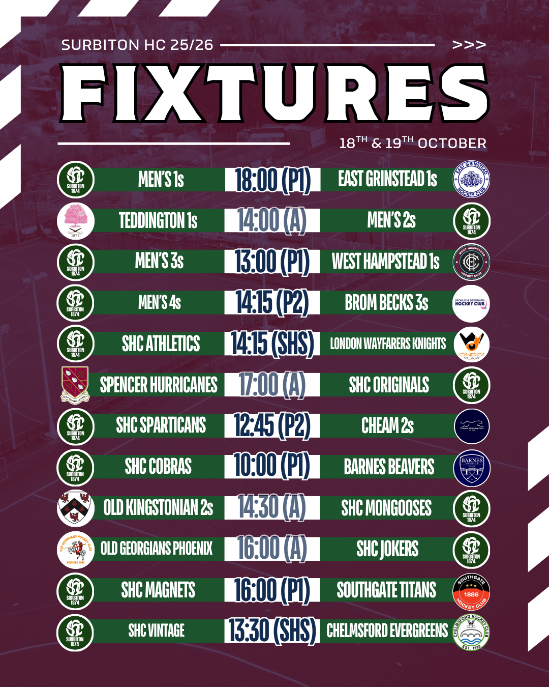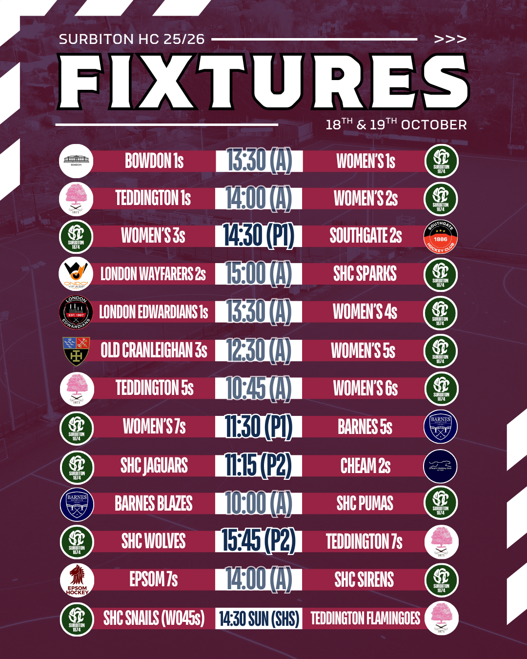 Scroll down for all club fixtures taking place on Saturday and remember that games on Pitch 1 are available to livestream on SHC TV