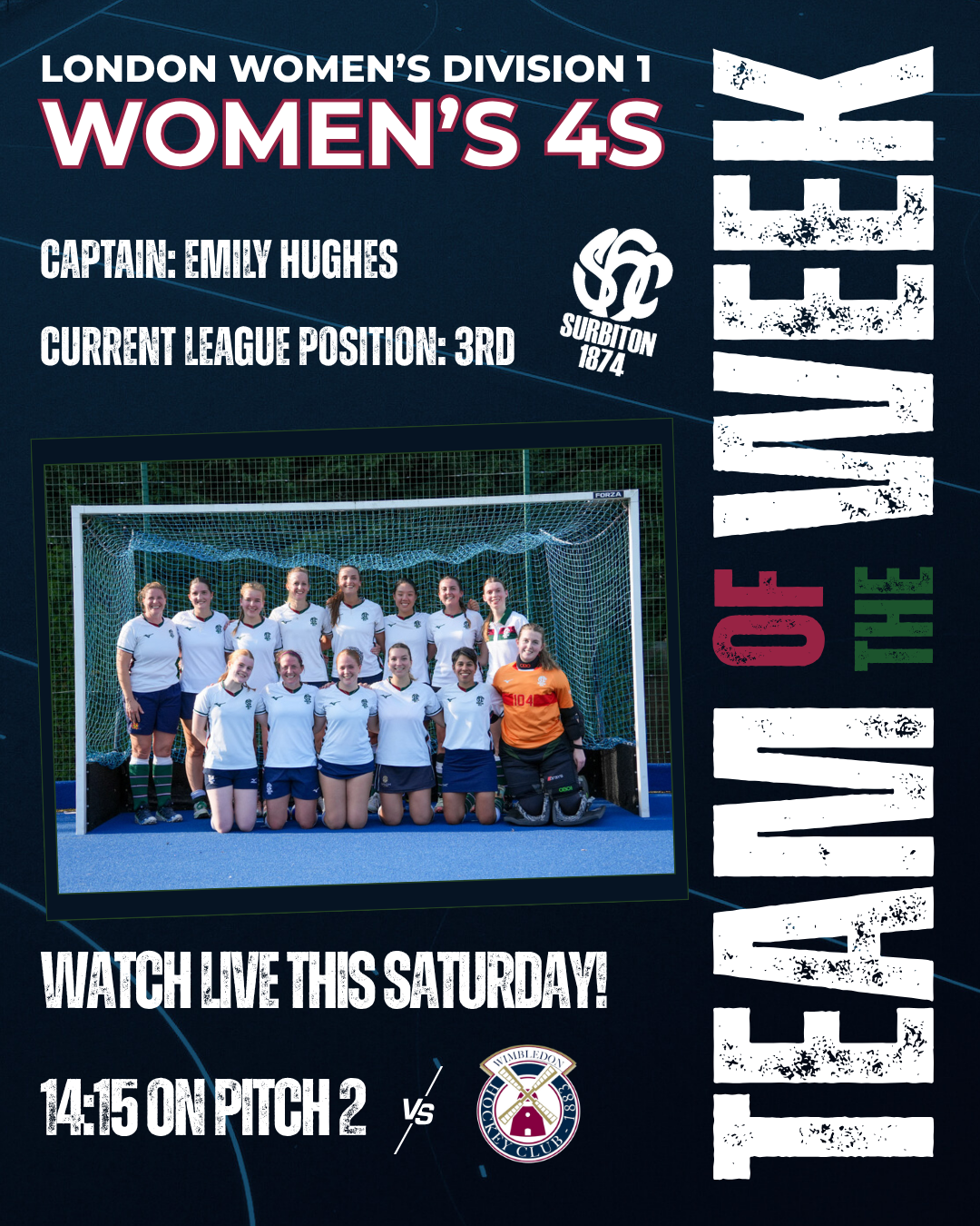 Team of the Week is our Women's 4s, who have had a good start to the season and this week host Wimbledon 3s on Pitch 2 at 14:15. Good luck team!