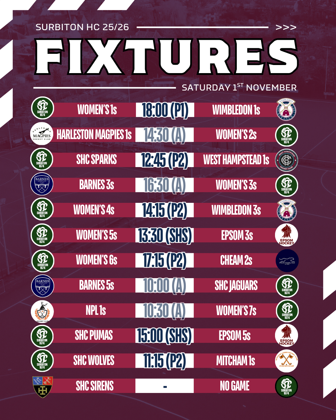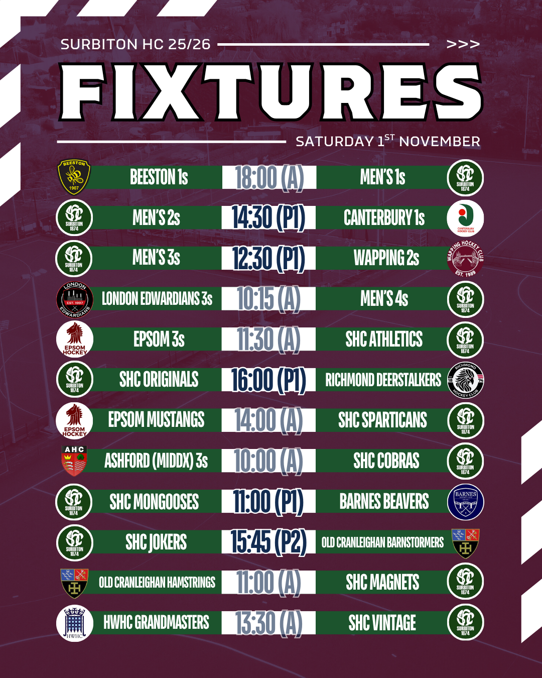 Scroll down for all club fixtures taking place on Saturday and remember that games on Pitch 1 are available to livestream on SHC TV