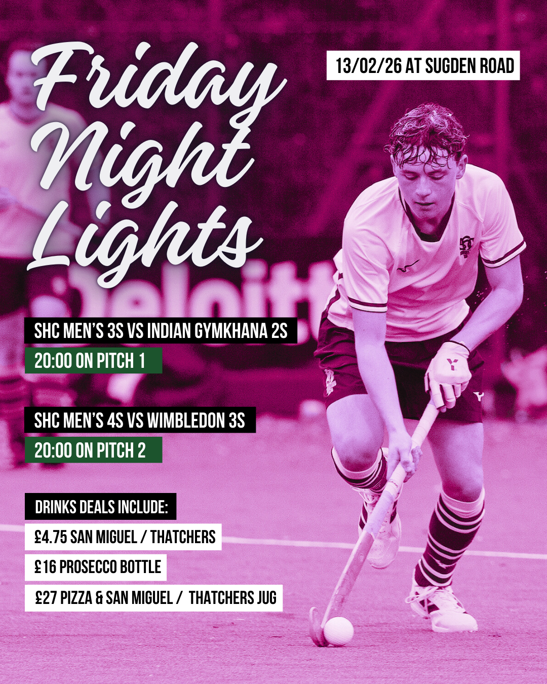 Come down on Friday evening to see a hotly contested evening of London Open-Men's Division 1 and 2 hockey, with our Men's 3s taking on Indian Gymkhana 2s on P1 and our Men's 4s hosting Wimbledon 3s on P2 - both games start at 8pm and there are drinks deals available in the clubhouse all evening (details below).