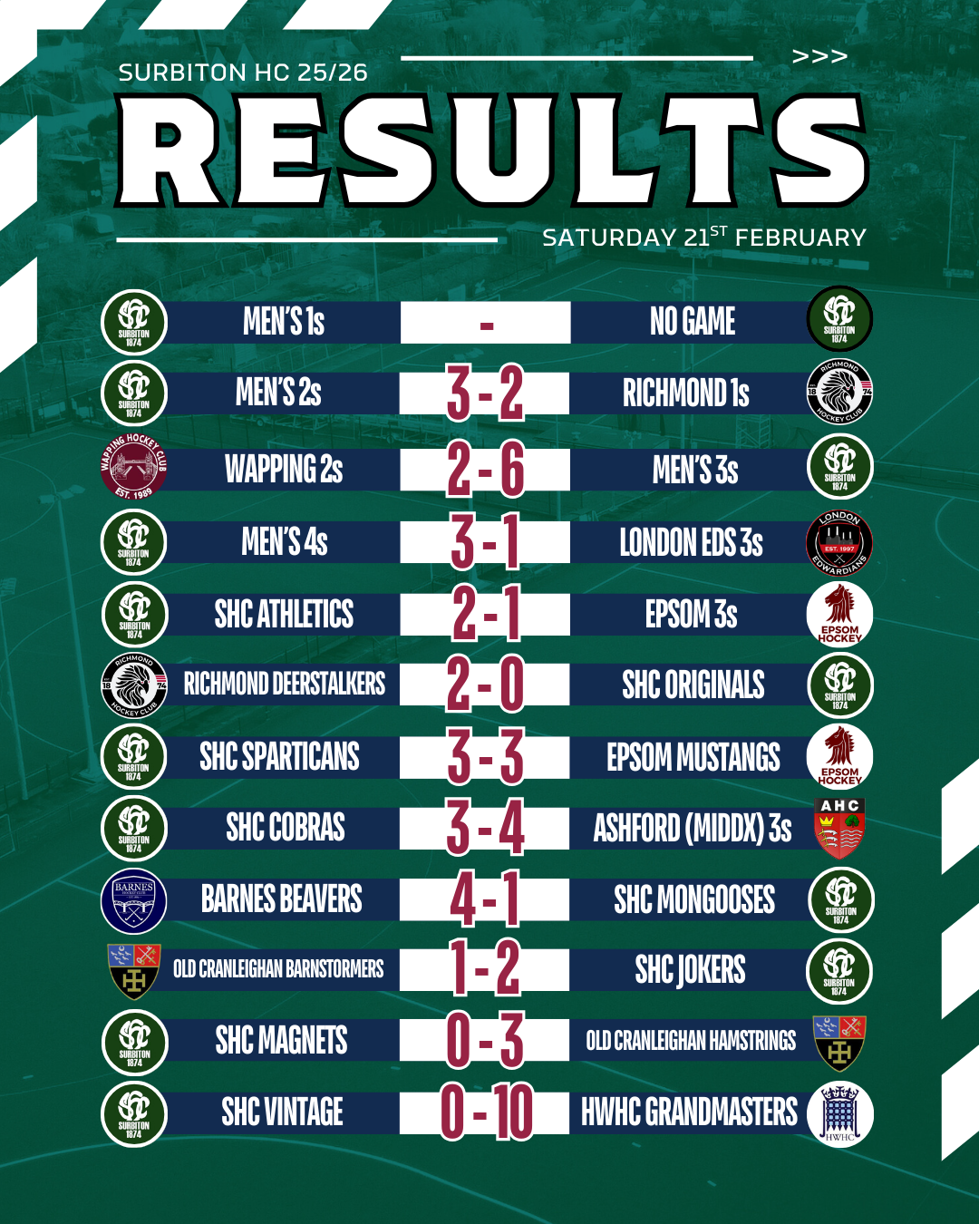 There were 22 senior games at the weekend, with some big scorelines and 66 goals going in for Surbiton!