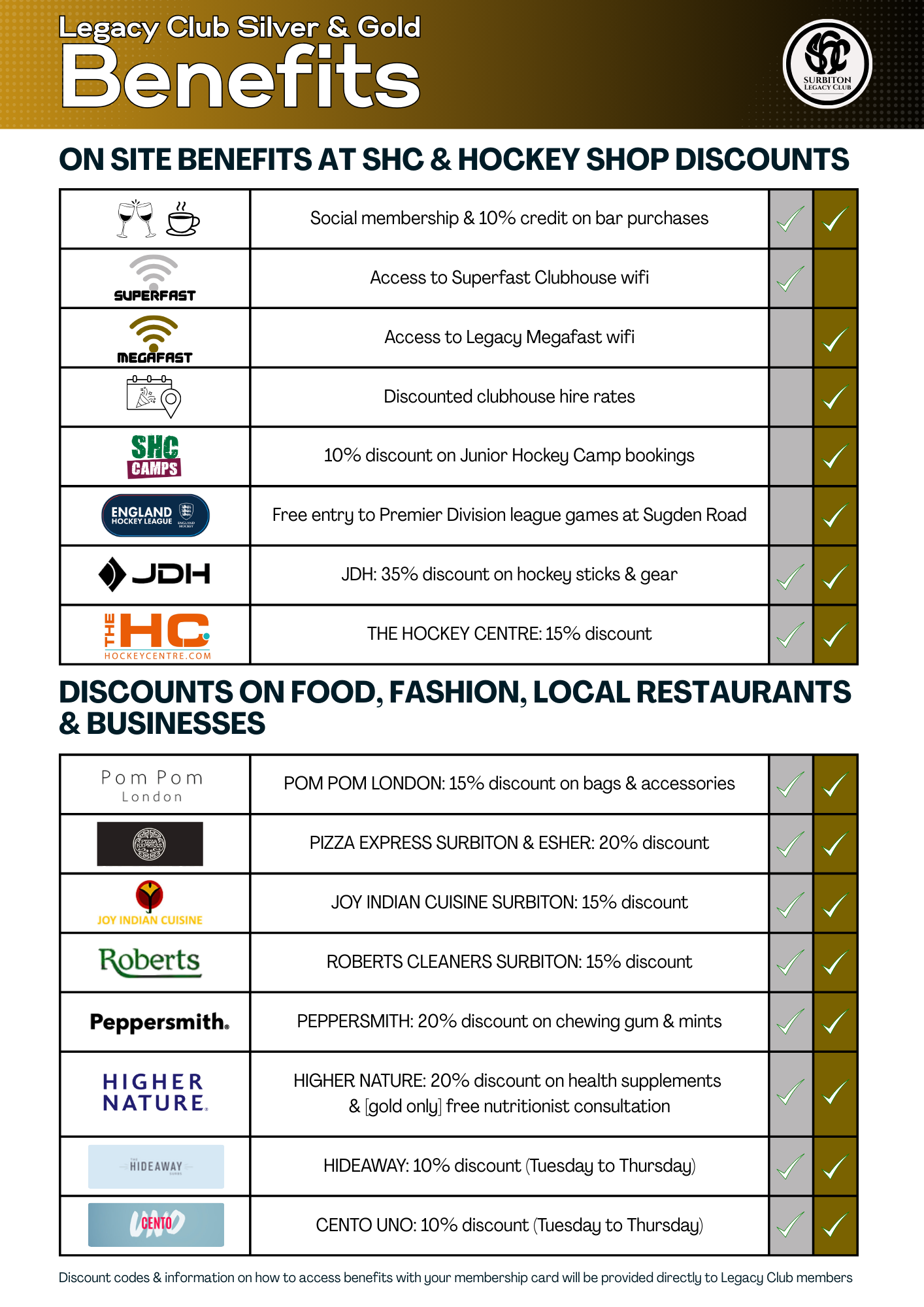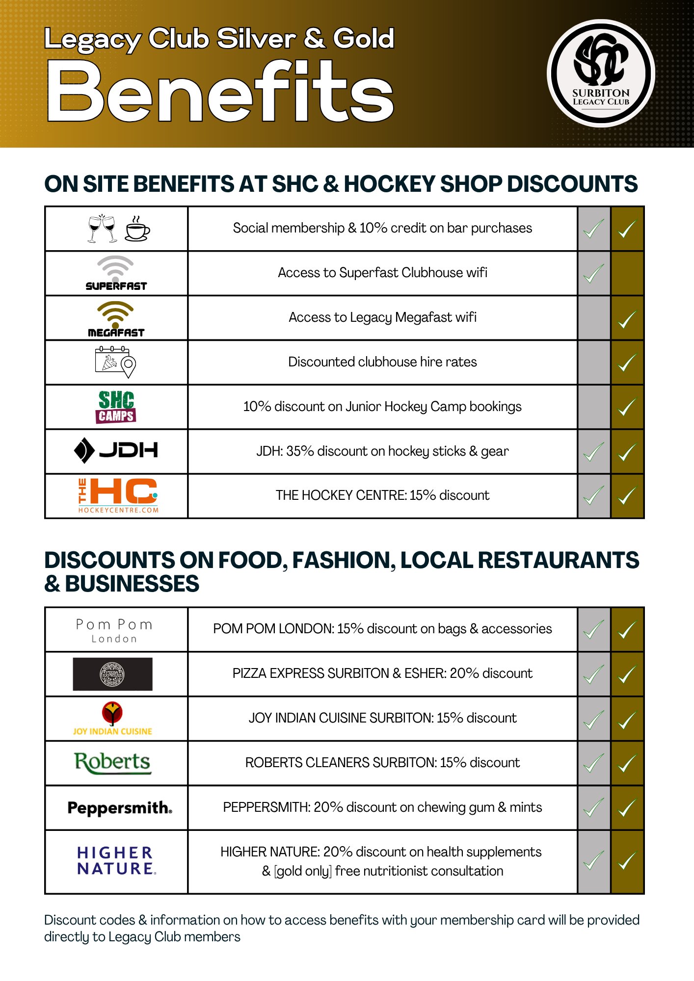 *Legacy Club joiners who are not already members of Surbiton HC will become social members to get around the complexity of prize draw issues for non members.