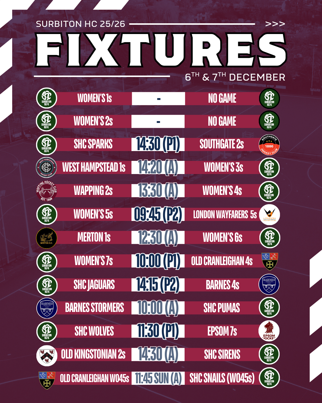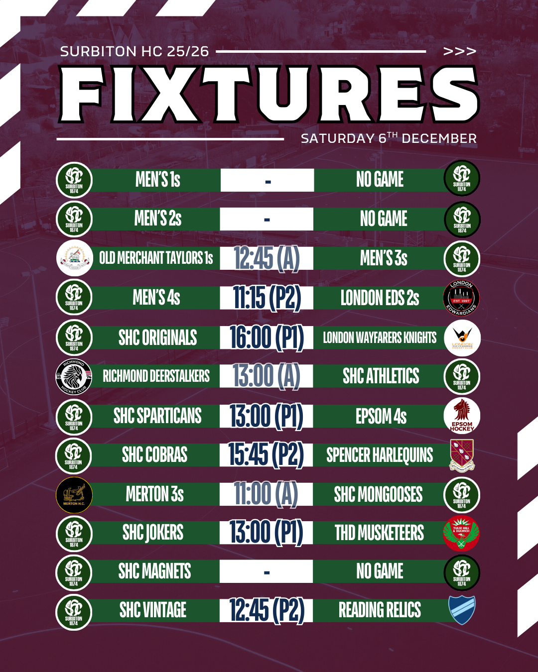 Scroll down for all club fixtures taking place on Saturday and remember that games on Pitch 1 are available to livestream on SHC TV
