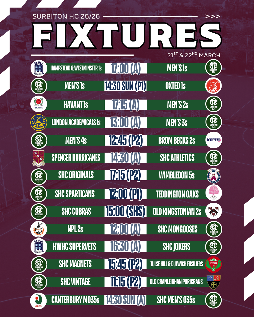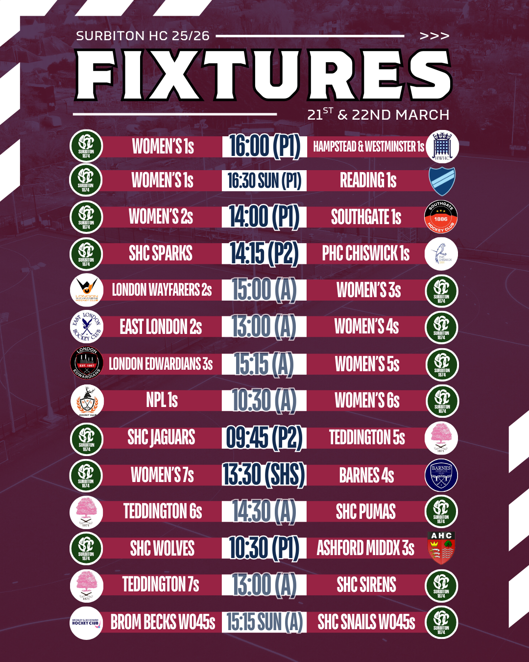 There's also a big weekend of Premier Division hockey to watch... the Women's 1s are back in action at SHC on Saturday afternoon, with a big clash against London rivals Hampstead & Westminster at 16:00 to open their Phase 2 campaign. The W1 return to home action at 16:30 on Sunday vs Reading in a repeat of the 2025 League Final, straight after the Men's 1s take on Oxted at 14:30.