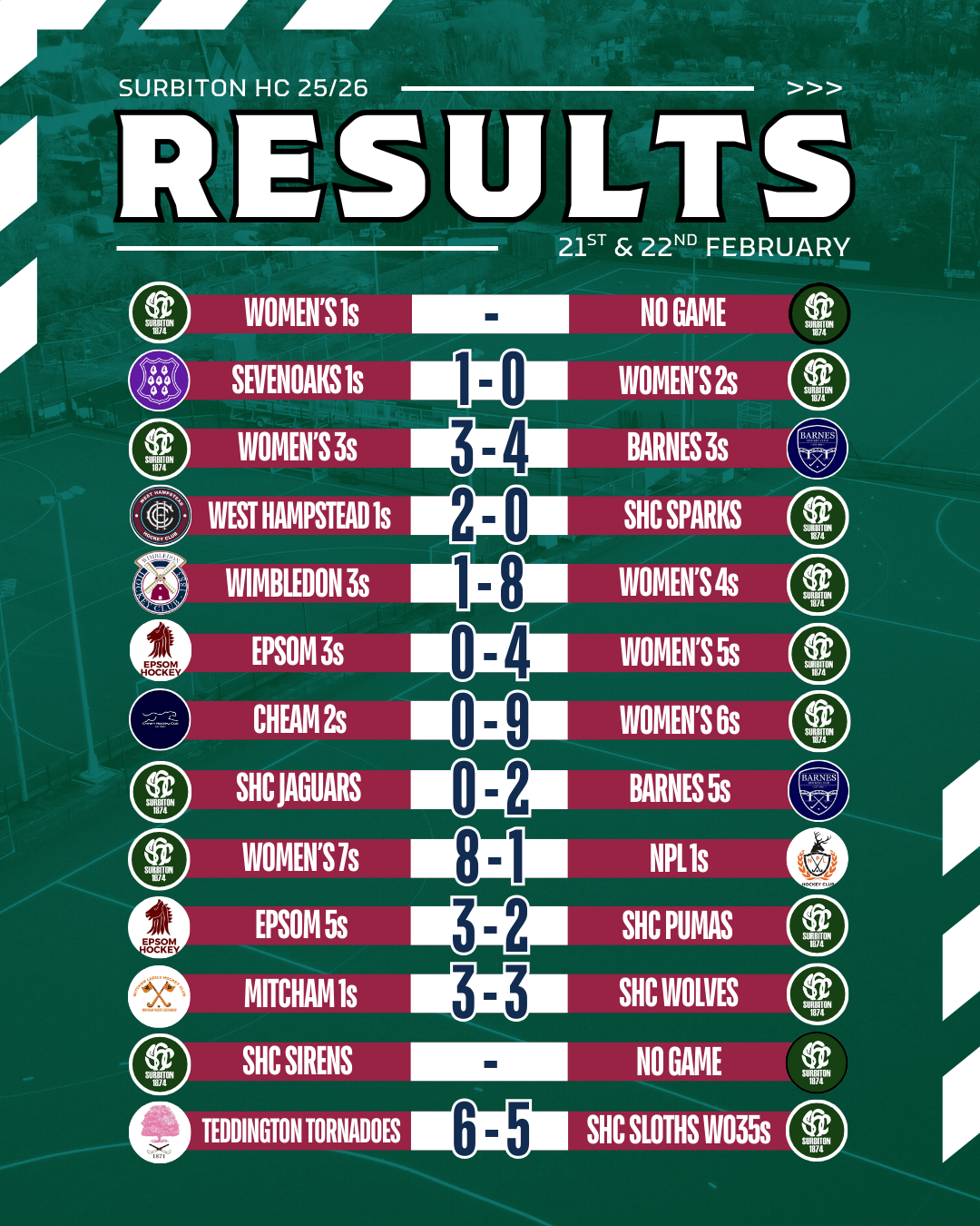 There were 22 senior games at the weekend, with some big scorelines and 66 goals going in for Surbiton!